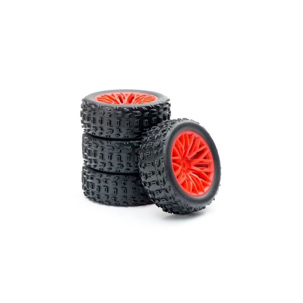 De banden bieden een goede balans tussen tractie en controle en zijn geschikt voor uiteenlopende ondergronden zoals asfalt en harde offroad banen. De velgen zijn stevig uitgevoerd en ontworpen voor probleemloze montage, zodat je snel weer klaar bent om te rijden.