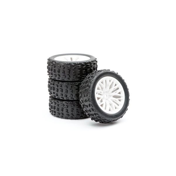 De banden bieden een goede balans tussen tractie en controle en zijn geschikt voor uiteenlopende ondergronden zoals asfalt en harde offroad banen. De velgen zijn stevig uitgevoerd en ontworpen voor probleemloze montage, zodat je snel weer klaar bent om te rijden.