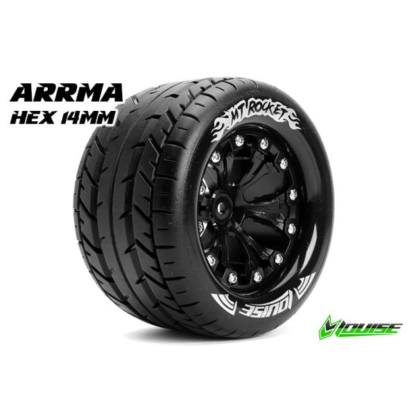 Set Louise MT-Rocket banden voorgemonteerd op 2.8" velgen. Geschikt voor auto's met 14mm wielmeenemers. Geschikt om als voor- of achterwielen te gebruiken voor een vierwiel aangedreven elektro monster truck (o.a. van het merk Arrma). Verpakt per 2 stuks.
