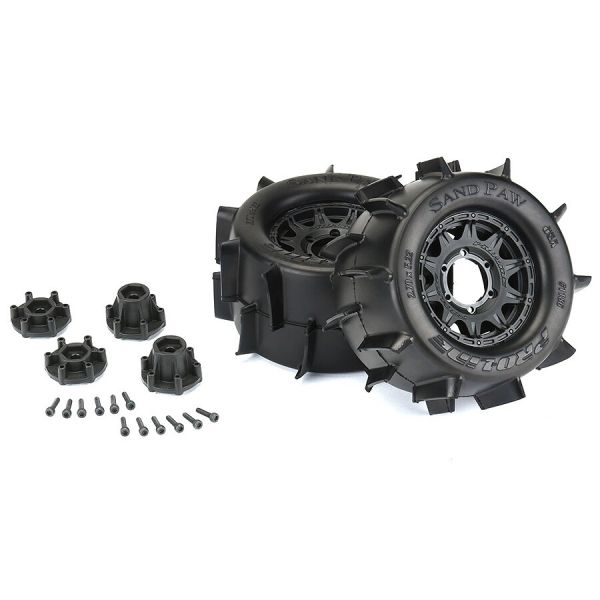 Proline Sand Paw 2.8" banden voorgelijmd op zwarte velgen met verwijderbare hex. Deze wielen zijn oa. geschikt voor de Stampede 4x4, 2WD en 4WD (voor/achter). Verpakt per 2 stuks.