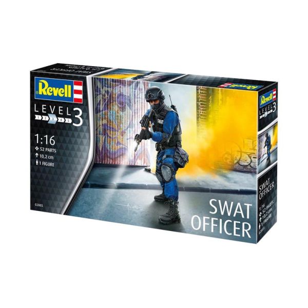 Met dit bouwpakket van Revell bouw je een Swat Officer in 1 op 16 schaal. Dit model moet nog volledig worden gebouwd waardoor er verf (08, 09, 35, 75, 302, 350) en lijm benodigd is. Deze worden standaard niet bij het bouwpakket geleverd.