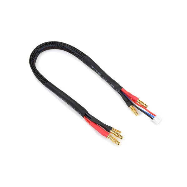 Laad/balanceer kabel met aan de lader kant 2x 4mm banana goud stekkers en een 2S XH stekker. Aan de accu kant zitten 2x 4mm & 1x 2mm banana goud stekkers. Deze laadkabel bevat 14 AWG Ultra V+ siliconekabel.