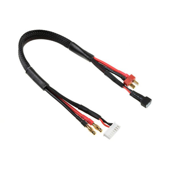 Laad/balanceer kabel met aan de lader kant 2x 4mm banana goud stekkers en een 6S XH stekker. Aan de accu kant zit een T-Plug (dean stekker) en een 2S XH stekker. Deze laadkabel bevat 14 AWG Ultra V+ siliconekabel.