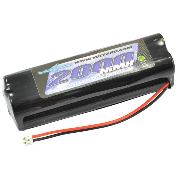 Voltz NiMH 2000mAh 9.6V zender accu. Deze accu is voorzien van een JR/Spektrum stekker. Afmetingen: 100x30x30mm.